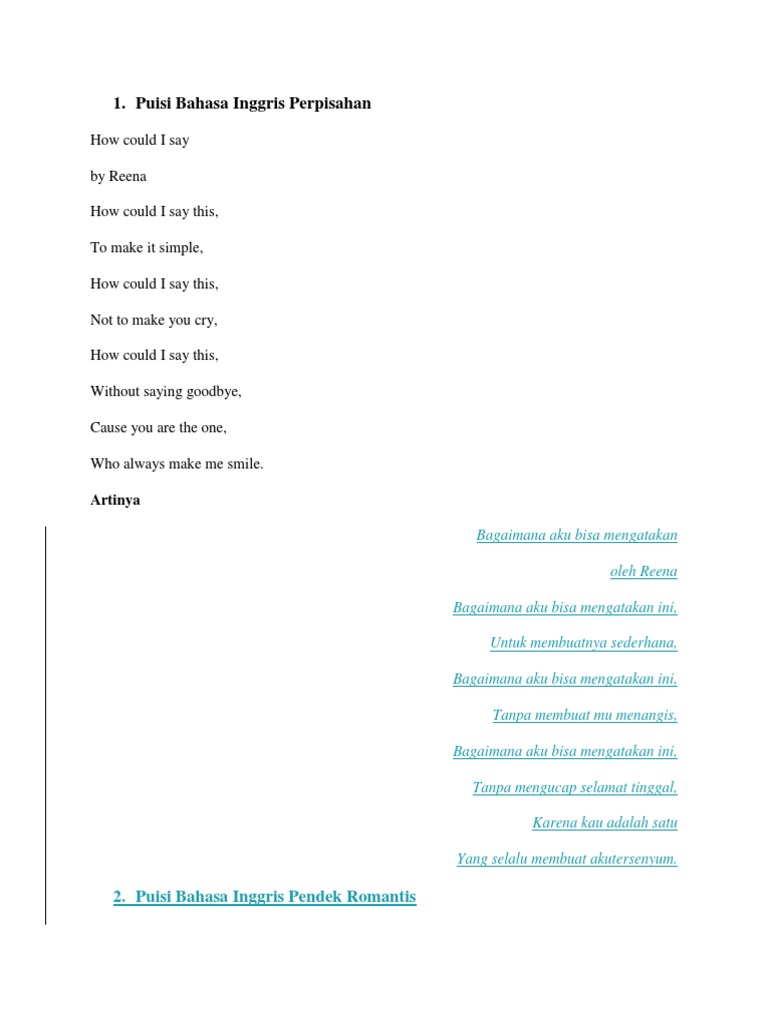 Puisi cinta panjang bahasa inggris dan artinya. 10 puisi romantis tentang cinta dan artinya dalam bahasa inggris. Kumpulan puisi panjang tentang rindu cinta sedih bebas dan tentang ibu. 33 puisi cinta teromantis dalam bahasa inggris dan artinya sekolahbahasainggris apakah kalian bingung bagaimana menulis puisi cinta yang romantis dalam bahasa inggris.